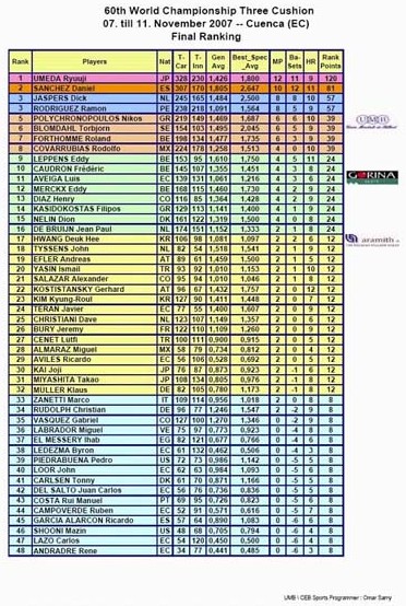El experimentado billarista, top ten del ranking de la Unión Mundial de Billar, casi a finales de 2007 conquistó el tercer lugar del 60º Campeonato Mundial de Billar Individual a Tres Bandas en Ecuador compitiendo entre 48 billaristas y jugando 5 partidas. En la fase eliminatoria ganó la serie “J” tras superar por 3-0 a los ecuatorianos Carlos Lazo (15-13, 15-6 y 15-9) y Ricardo Avilés (15-1, 15-5 y 15-5). Ya en octavos de final derrotó al holandés Jean Paul De Bruijn, subcampeón mundial en el 2005, a quien ganó 3-2 (15-14, 9-15, 15-13, 13-15 y 15-11). Con este resultado clasificó a cuartos de final y jugó su partida más difícil contra el griego Nikos Polychronopoulos, al que se impuso también por 3-2 (8-15, 8-15, 15-13, 15-5 y 15-14).